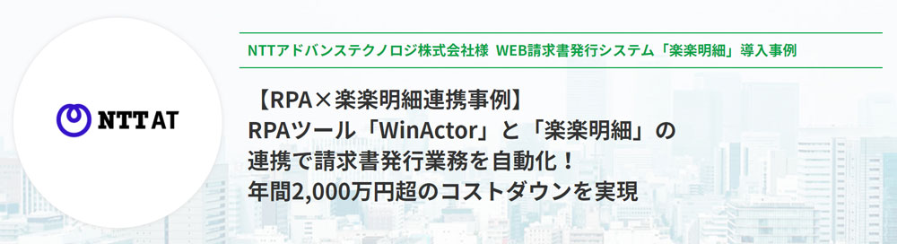 NTT-ATでは、「楽楽明細」の導入により、複数のシステムで行っていた押印管理や発行管理などの請求書発行業務の一元化を実現し、また自社内での印刷、郵送手配作業も不要になったことから、大幅な業務効率化に成功しています。また、基幹システムから「楽楽明細」への請求データの連携を「WinActor」で自動化することで、ヒューマンエラーや作業の遅延の防止を実現しました。